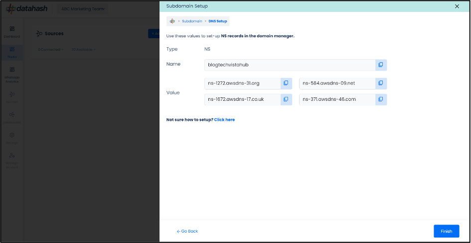 - Login to Datahash and open the sub-domain set-up by clicking on the Datahash icon in the center