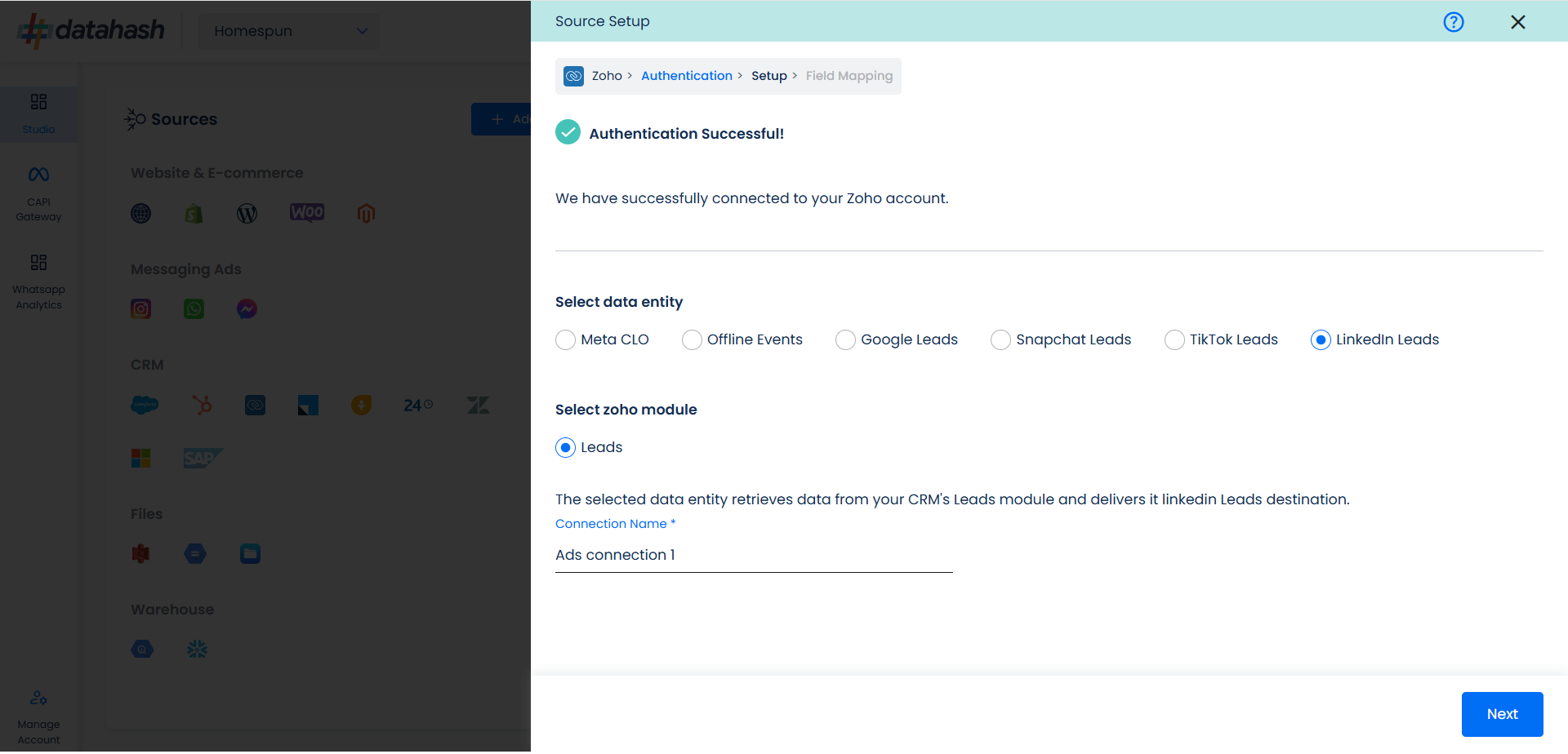 Select the Zoho CRM module from which you want to track the lead status updates into LinkedIn Leads Conversions API and provide a name to the connection.