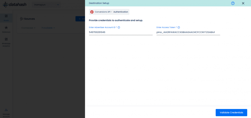 - Enter both the Advertiser Account ID and Access Token in the Datahash dashboard.