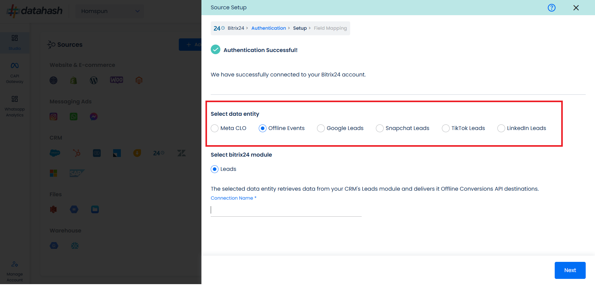 Select the Bitrix24 CRM module from which you want to track the lead status updates into Offline Conversion API and provide a name to the connection.