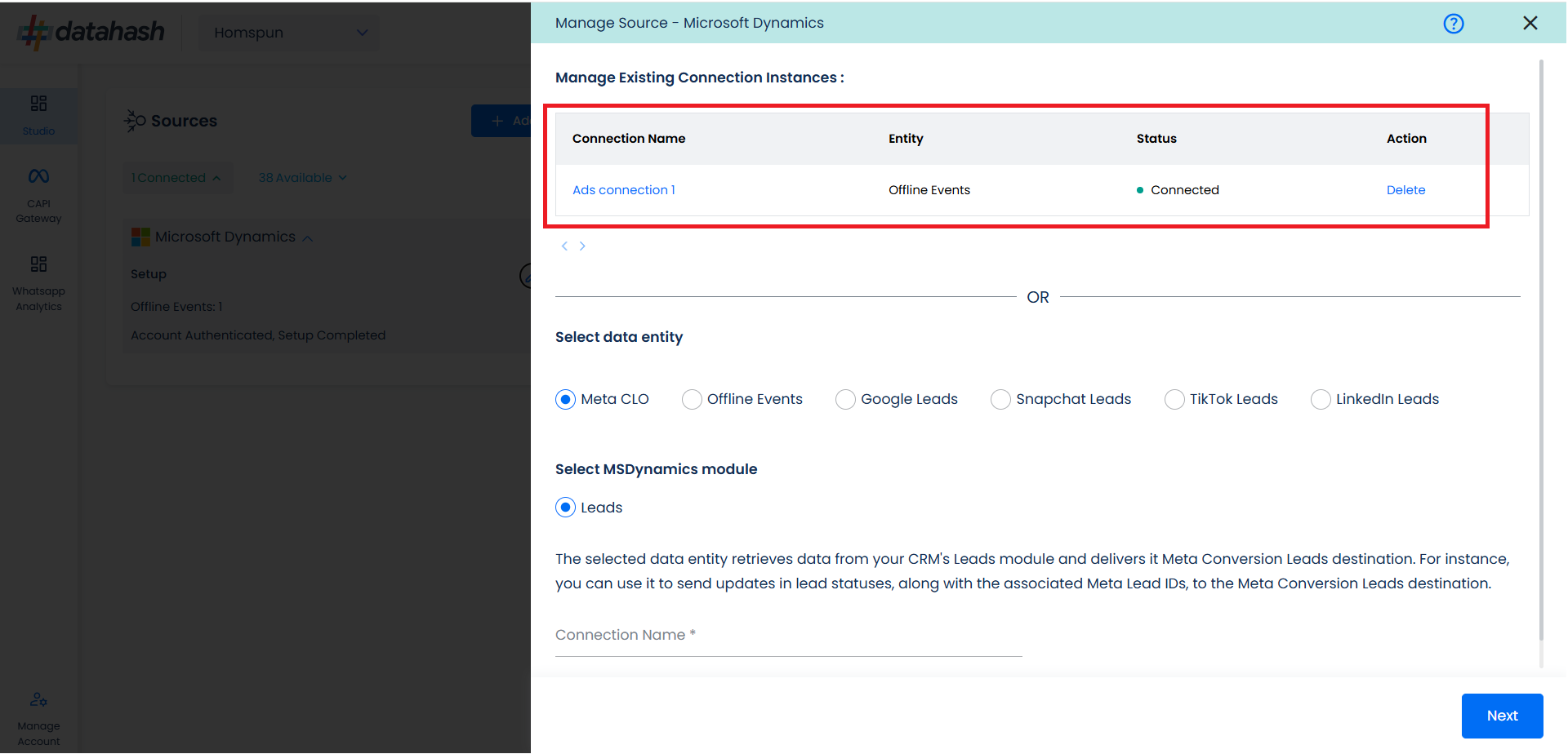 - Select the MS Dynamics module from which you want to track the lead status updates into the Offline Conversion API and provide a name to the connection.