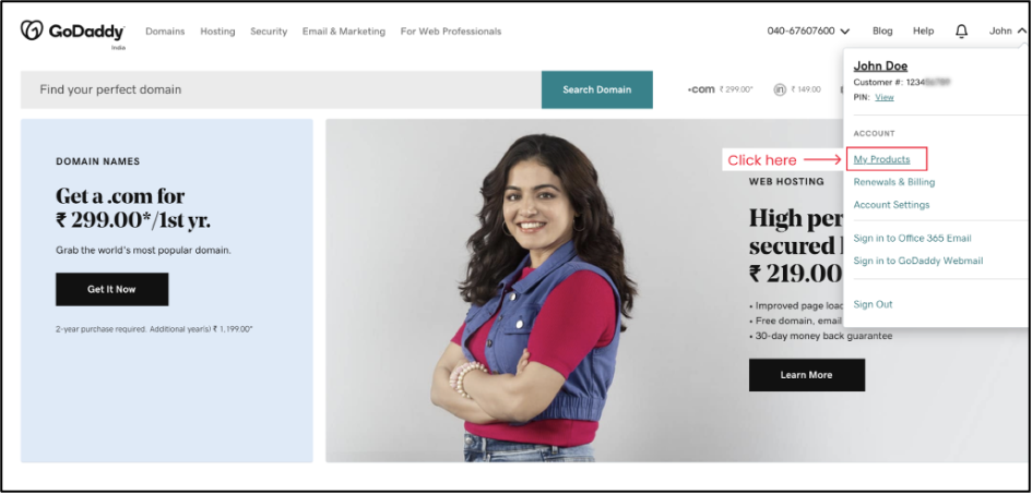 Step 1: Log in to your GoDaddy account and select ‘My Products’ from the Account Menu.